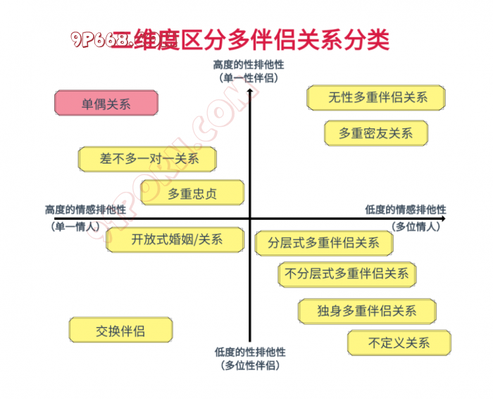 这里,通过性爱排他性和情感排他性两个维度,分为十个主要类别(我个人认为,在前一张图里的那么多分类,诸多都是分支,主干就是这十个类别)